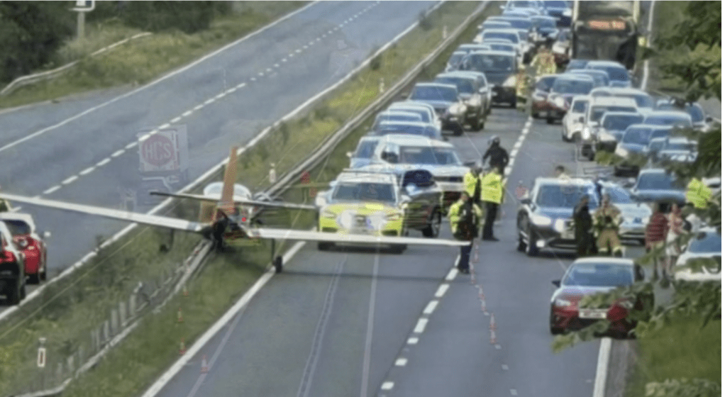 A light aircraft made an emergency landing on A40 Golden Valley, close to Village of Churchdown, near a main commuter road in Gloucestershire after a suspected engine failure just before 18:00 BST and according to a police spokesperson “No-one was injured and no other vehicles were involved”. People got out of the aircraft safely.