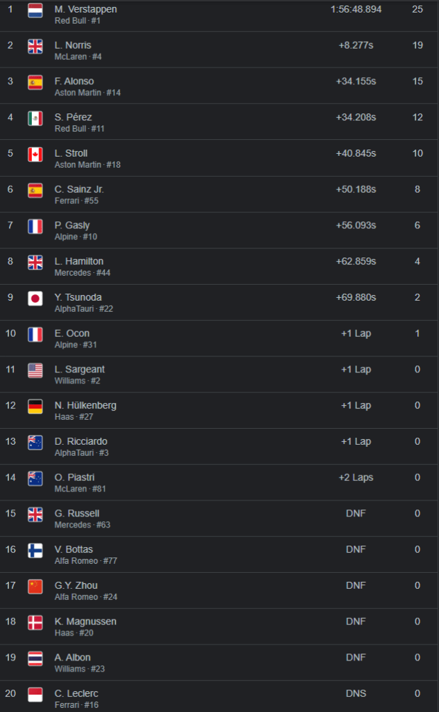 Red Bull’s Max Verstappen has won the Sao Paulo Grand Prix, his 17th victory of the season. The race was incidentally interrupted by an early red flag after debris was spread on the circuit at the first corner following contact between Kevin Magnussen and Alexander Albon. Ferrari driver Charles Leclerc failed to take the start of the race after a hydraulics failure sidelined him into the barrier on the formation lap. Lando Norris of McLaren scored his fifth podium in six races, while Fernando Alonso survived battle with Sergio Perez in the final laps of the race to take his first podium since the Dutch Grand Prix.