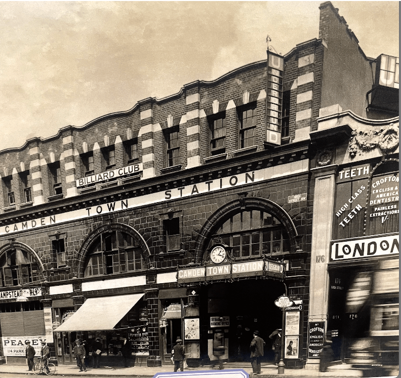 Camden Town station, which opened in 1902, was used as an interchange by Charing Cross, Euston, and Hampstead railway the forerunner of today’s Northern Line tube, serving as the point where customers going north could transfer between services. Now more than 20 million journeys start or end at Camden Town Station. One branch went to Highgate the current Archway station and one branch went to Hampstead. The station was designed by architect Leslie Green and features the oxblood terracotta faience tile exterior and moon windows that are trademarks of the station designs. In the early 1920a services from the City and South London Railway began calling at the station. In October 1940, the station was damaged during the Blitz, destroying one side of the station, although the station entrance was unscathed. At the Kentish Town Road entrance, you can see a triangular-shaped frame which is an original Edwardian advertising board, and above each entrance is a metal roundel silhouette.