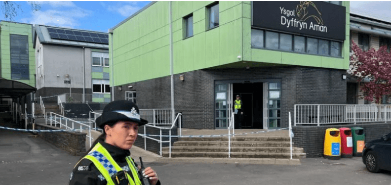 Police and two air ambulances were called out to Ysgol Dyffryn Amman Valley School a Welsh secondary school, in Ammanford, Carmarthenshire, after Liz Hopkin (53), a special needs teacher was stabbed in the neck four times by a female pupil during an attack is seriously ill but has been sent home to recuperate. Three people and a pupil were injure in the attack at around 11:!5am on Wednesday. Worried parents waited for several hours at the gates of the school, which was “in lockdown”, before being tearfully reunited with their children as the school day ended. A teenage girl has been arrested on suspicion of attempted murder, Dyfed-Powys police say. Darren Campbell, a hero teacher tried to restrain the girl with the knife in south-west Wales, according to his brother Cefin Campbell, a Plaid Cymru, member of Senedd (MS). The teacher retired last year but was re-hired on a part-time basis.
