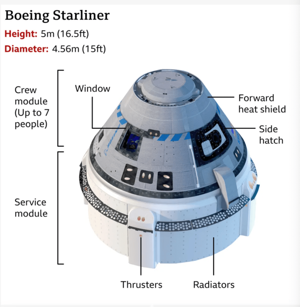 Boeing Starliner is 5m ( 16.5ft0 high and 4.56m (15ft) diameter, weighting 760lbs (340kg) of cargo, with crew module which can accommodate unto 7 people. A key supply item is a replacement pump for the system on the ISS that purifies urine back to drinking water. Much of the cargo, is simply Boeing merchandise that will become memorabilia for this vital test flight, which includes mission patches, coins, silver Snoopy pens, American flags and a hard drive with about 3, 500 pieces of artwork from children across the world. If everything goes to plan, Wilmore and Williams will return to Earth late next week. The Starliner is designed to come back to land, using airbags to soften contact with the ground, and touchdown could be performed in several place in the US southwest, depending on local weather forecasts before making a final choice.