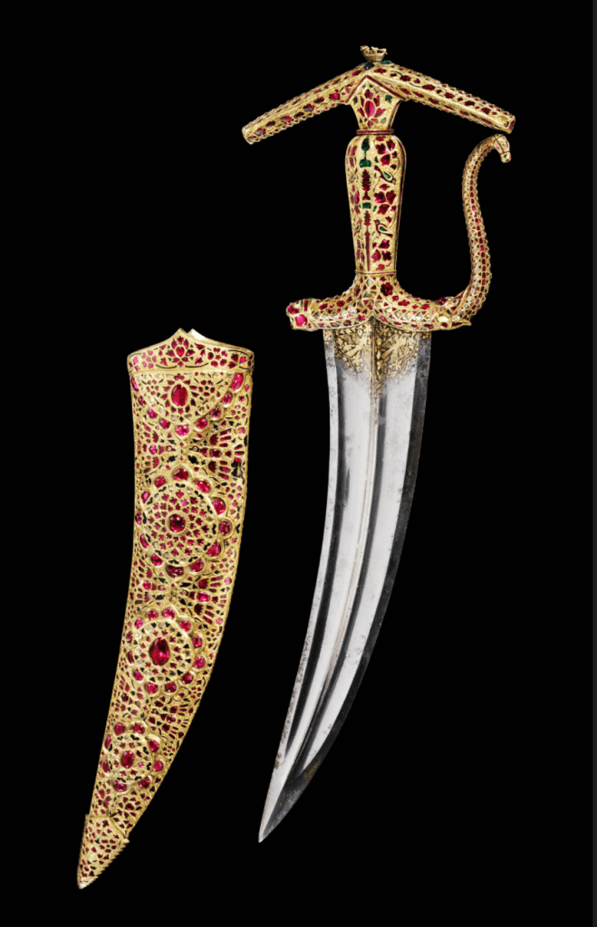 See the bejewelled dagger and scabbard (c 1620), the portrait of