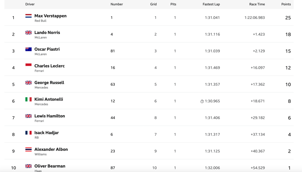 Verstappen led the two McLarens for the entire first stint, the three lapping closely together. Verstappen and Norris stopped on the same lap, one later than Piastri, and there was an immediate flashpoint. Norris complained about Verstappen’s driving, saying he had been pushed off while Verstappen countered by saying his rival had driven off by himself. After the race Norris said:” he had the position and he had the right to do what he did, so fair play.”