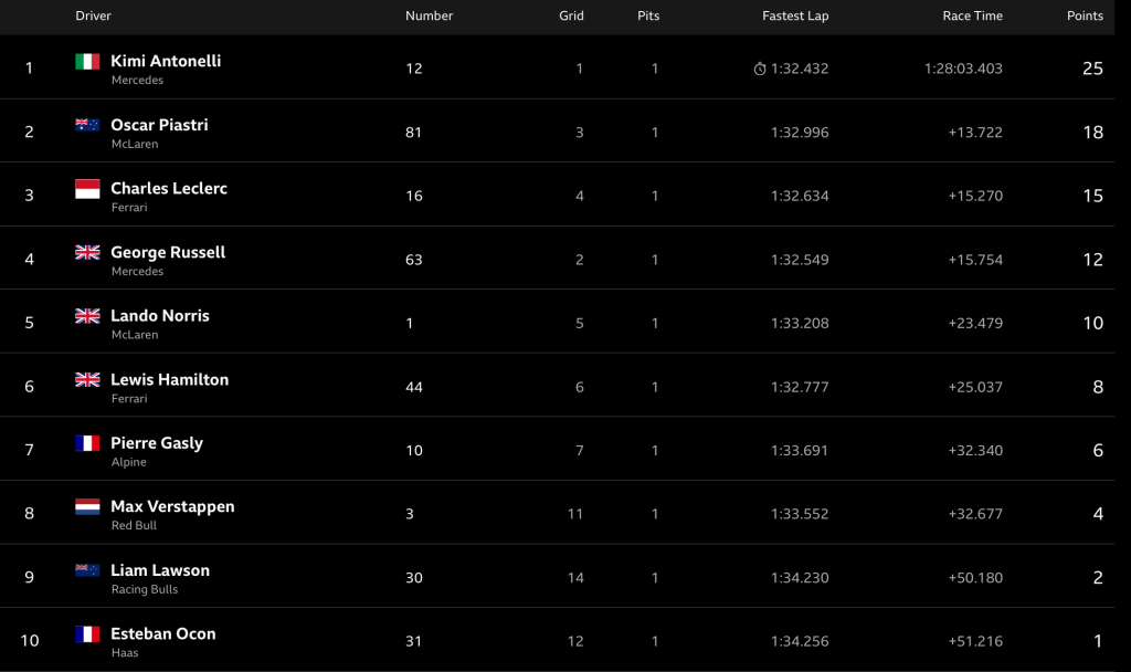 At the restart Antonelli quickly built a lead over his competitors as Piastri managed to stay a couple of seconds clear of a scrap between Ferraris and Russell, with Hamilton, who also benefited from the safety car, passing his former Mercedes team mate aty the restart. Antonelli was lapping quickly enough once in the lead following the stops of Piastri, Russell and Lecierc that he was building a gap.